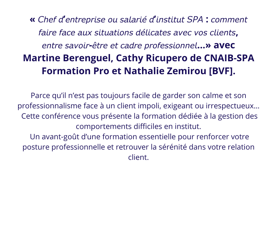 14h30 : Conférence sur le bien-être des salariés – Nathalie Zemirou, Martine Berenguel Co-présidente CNAIB-SPA et Cathy Ricupero directrice de CNAIB-SPA Formation Pro
